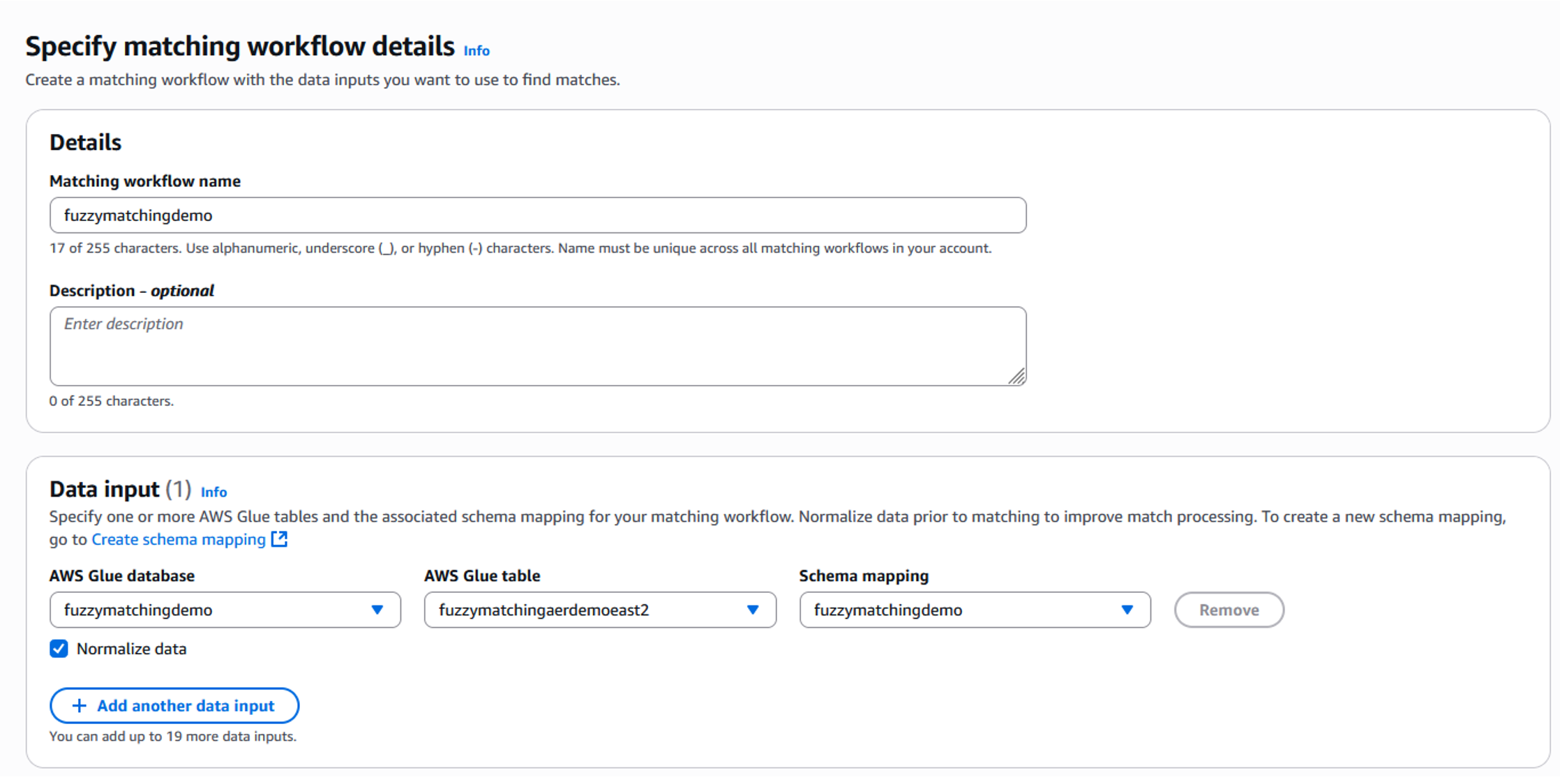 - スキーママッピングが作成されたら、次はマッチングワークフローを作成します。マッチングワークフローは、ソース間でレコードをマッチングおよびリンクするために必要な入力、関連するマッチング手法、ルール、または機械学習を定義するのに役立ちます。マッチングワークフローを作成するには、左側のメニューにあるワークフローのドロップダウンから「マッチング」を選択し、「マッチングワークフローの作成」をクリックします。マッチングワークフローの詳細指定画面でワークフロー名を追加します。この例では「Fuzzymatchingdemo」としています。データ入力エリアで、前のステップで作成した適切な AWS Glue データベーステーブルとスキーママッピングを選択する必要があります (図 8 参照) 。