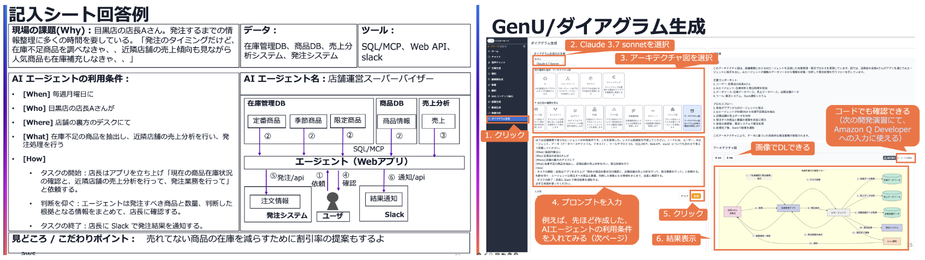 このワークでは、先ほどのハンズオンで作成した GenU の各種機能も活用し、要件の解像度を高める手法も実践しました。例えば、議事録生成 を使い、ディスカッション中の音声から 利用者視点の 5W1H を自動整理させたり、ダイアグラム生成 でシステム関連図の作成や、画像生成 で利用シーンをビジュアル化、チャット でシステム要件定義を行うなど、生成 AI の力を借りることで議論から効率良く解像度を上げていきました。