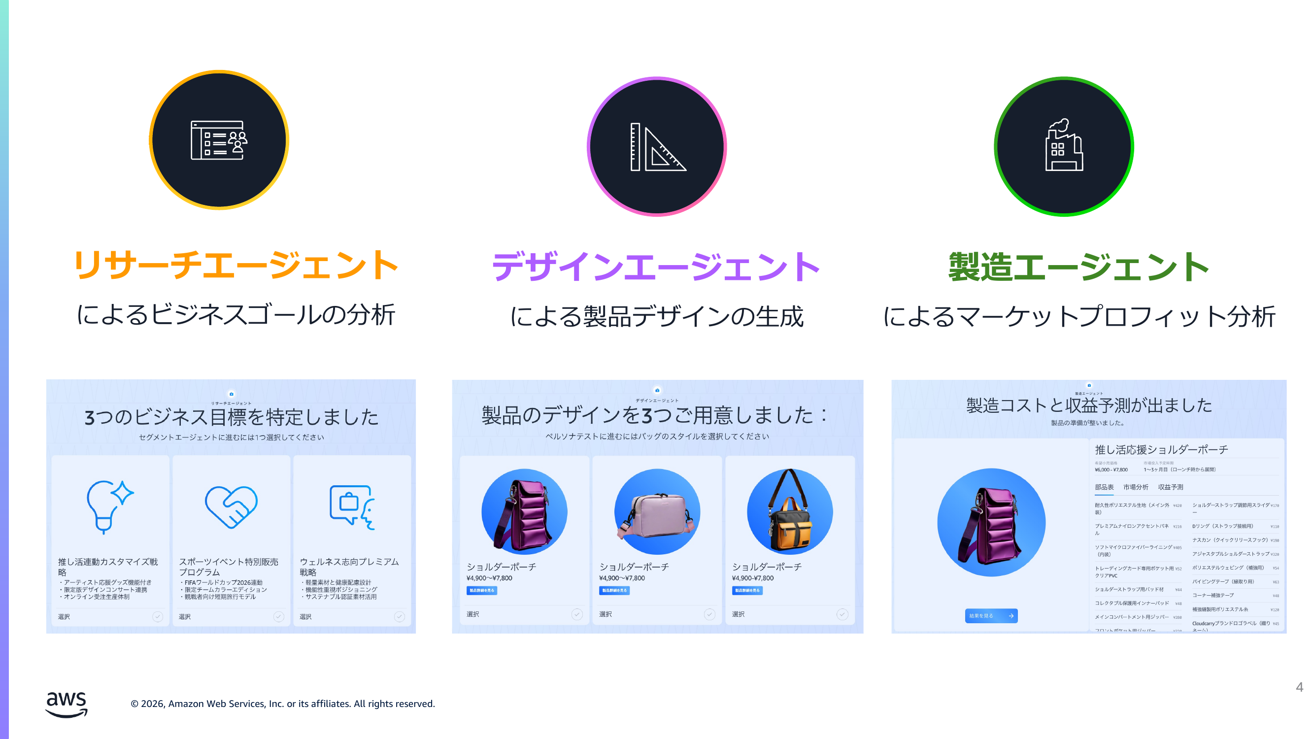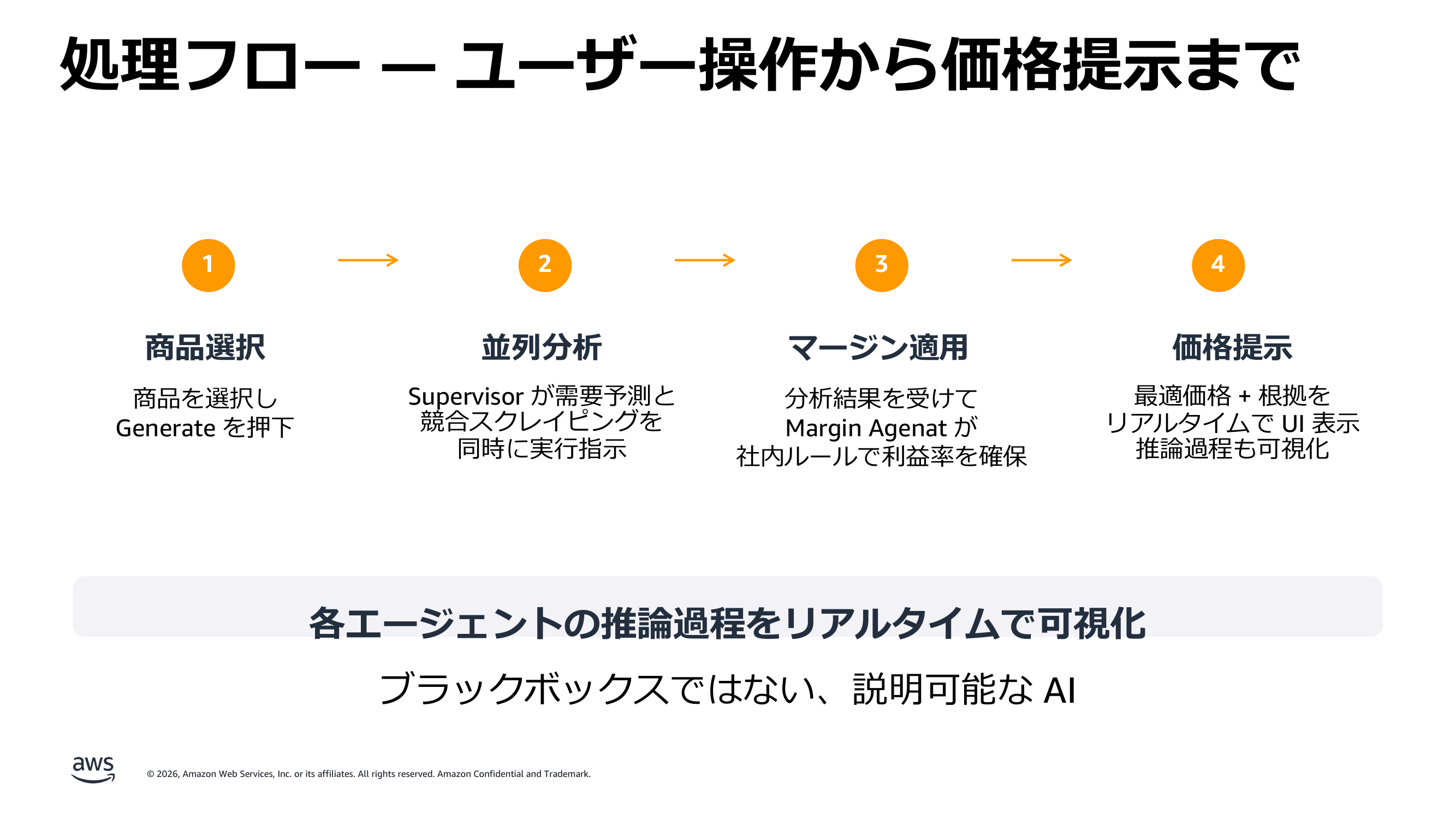 - Retail Pricing Agent:競合調査・需要分析・価格決定の3つのエージェントが連携し、生成 AI で価格戦略を自動化するデモをご紹介しました。(Retail Pricing Agent 詳細資料)