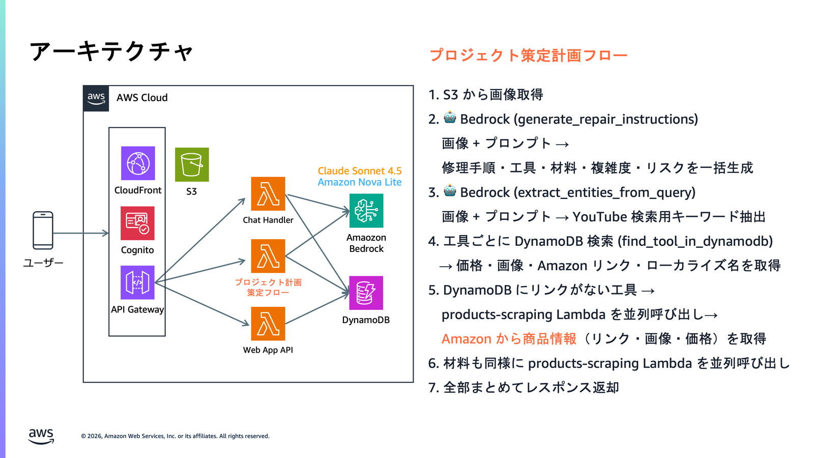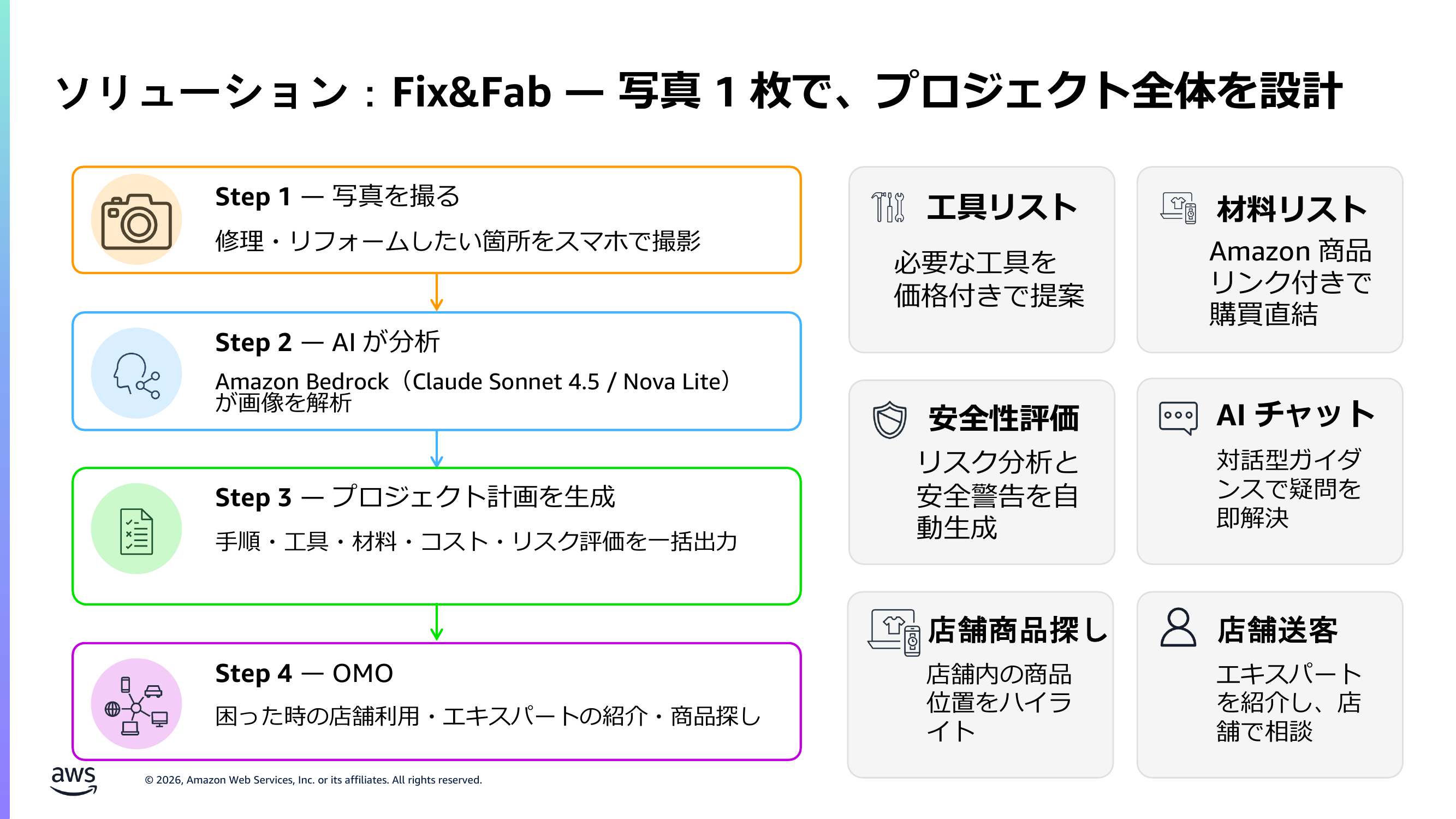 - Fix&Fab:写真と説明だけで DIY の修理手順を生成し、ショッピングリストや専門家紹介まで提供するデモをご覧いただきました。(Fix&Fab 詳細資料)