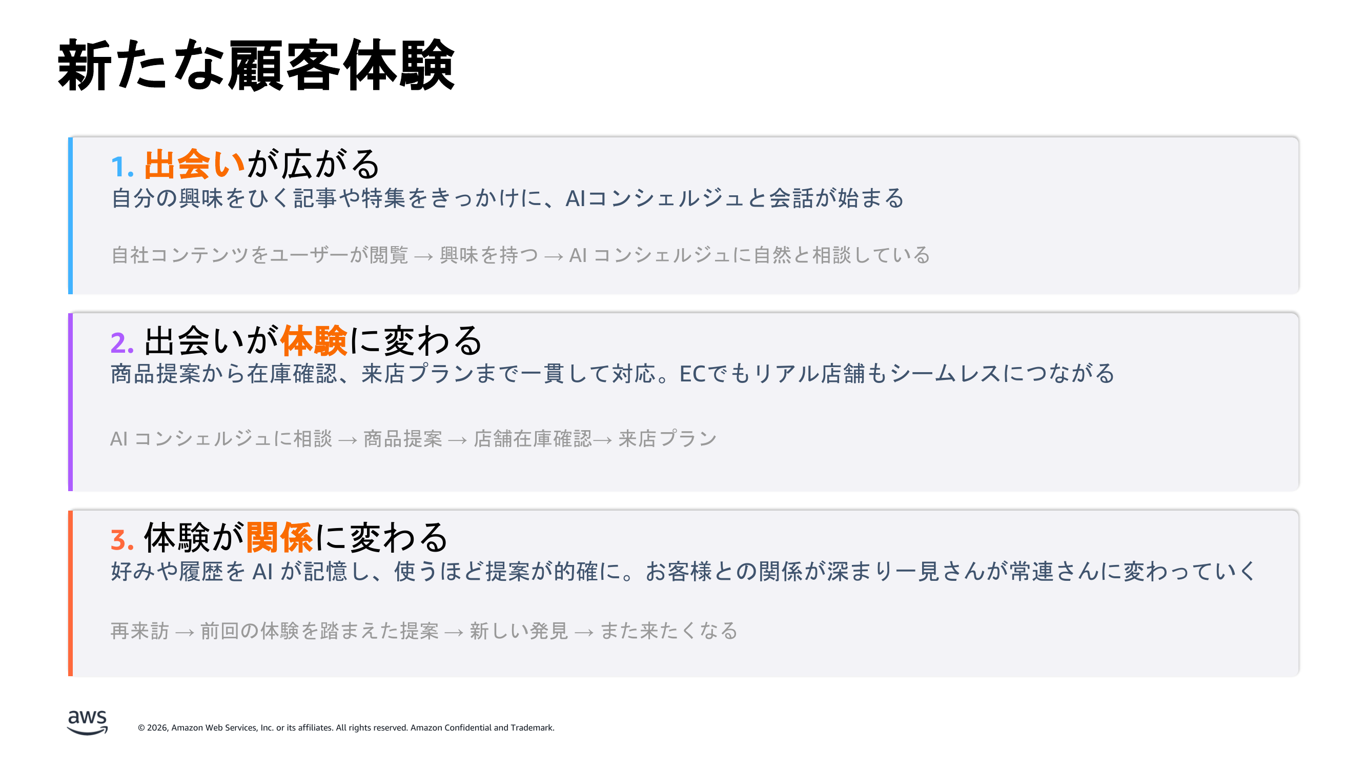 デジタルと実店舗をシームレスにつなぐ顧客体験は、業界の重要なテーマです。3つのデモで、AI が「一人ひとり」に寄り添う新しい顧客体験をご紹介しました。