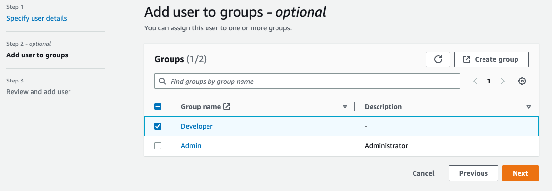 DeveloperとAdminの 2 つのグループを作成します。そして、作成した SAML アプリケーションに 2 つのグループを割り当てます。