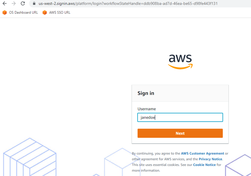 https://opensearch-domain-name-random-keys.us-west-2.es.amazonaws.com/_dashboards) - AWS アクセスポータル URL – IAM Identity Center コンソールで、ナビゲーションペインの Dashboard を選択し、Settings summary のアクセスポータル URL を選択します。(例: