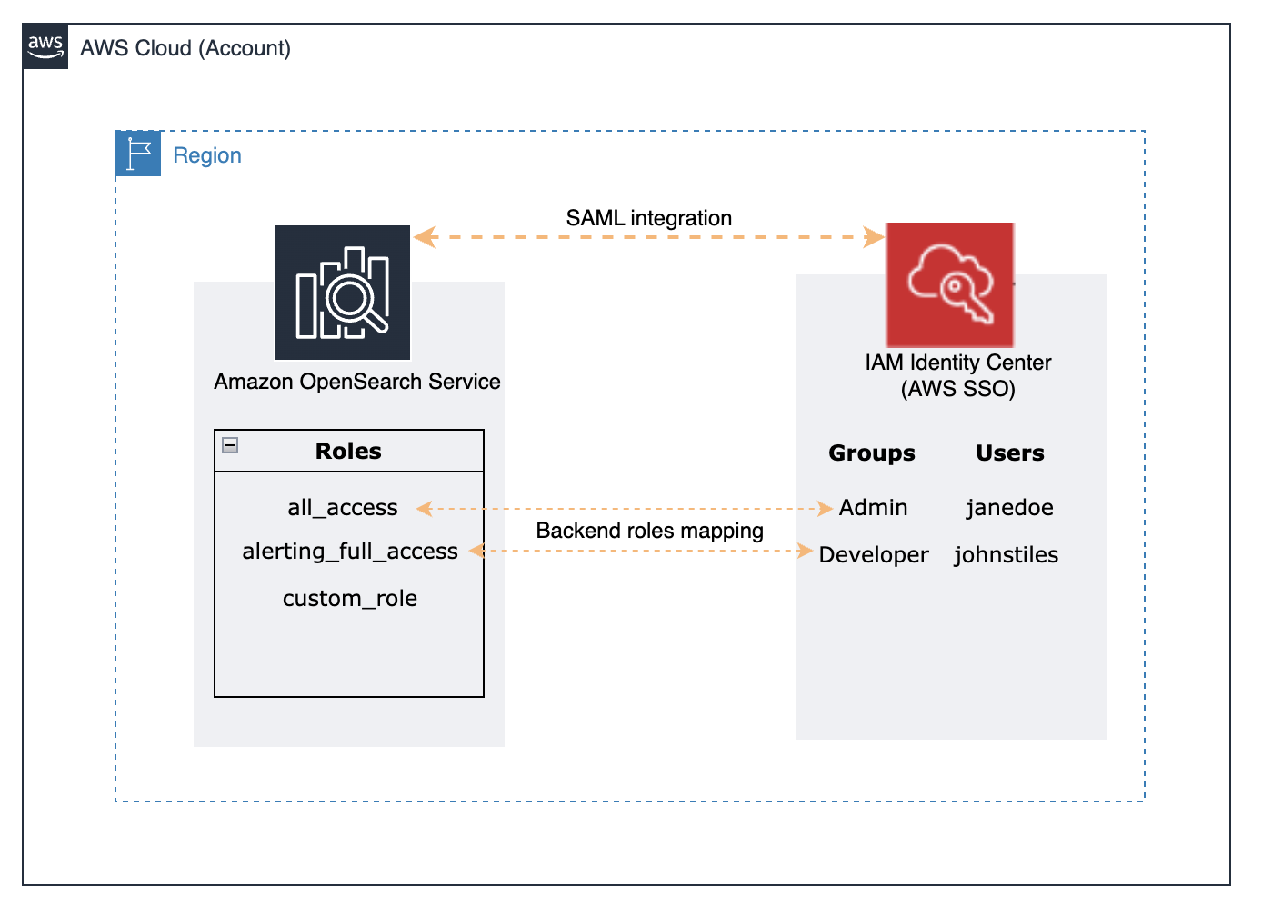 次の図はソリューションアーキテクチャを示しています。2 つのグループを作成し、各グループにユーザーを割り当て、IAM Identity Center で属性マッピングを編集します。IAM Identity Center を ID プロバイダー (IdP) と統合している場合は、このテストに IdP にマッピングされた既存のユーザーとグループを使用できます。このソリューションでは、管理者用の all_access と、OpenSearch Service アラートの管理のみが許可された開発者用の alerting_full_access の 2 つのロールを使用します。OpenSearch Dashboards でグループ ID によるバックエンドロールマッピングを設定できます。次の図に基づいて、ロール all_access を Admin グループに、alerting_full_access を Developer グループにマッピングできます。ユーザー janedoe は Admin グループに、ユーザー johnstiles は Developer グループに所属しています。