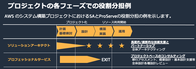 SAとProServeの違いを質問される機会も多いので簡潔に説明します。SAとProServeはどちらもお客様の技術支援を行う技術ロールですが、お客様との関わり方にはいくつかの違いがあります。ここでは、関わる支援フェーズの違いを図示してみました。