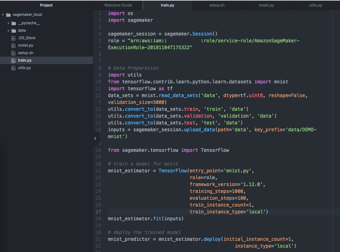 すでに説明したとおり、修正するコードは tensorflow_distributed_mnist.ipynb です。このノートブックのファイルではrole = get_execution_role()を利用して SageMaker のノートブックインスタンスのロールを取得し、学習用や推論用のインスタンスに付与しています。オンプレミス環境では、SageMaker のノートブックインスタンスを利用しないため、ロールの取得ができずエラーが発生します。従って、実行に必要な情報として作成した IAM ロールを以下のように文字列で与えるよう変更します。role = 'arn:aws:iam::(12桁のAWSアカウントID):role/(ロール名)'API を実行するノートブックファイル (.ipynb) は、API を実行するコードを含んでいれば Python ファイル (.pyファイル) に置き換えることも可能です。Python ファイルとすることで、高機能なテキストエディタによる編集も可能になります。以下のスクリーンショットは、tensorflow_distributed_mnist.ipynb のコードを抽出して Python ファイル (train.py) を作成し、エディタ上で編集しているものです。