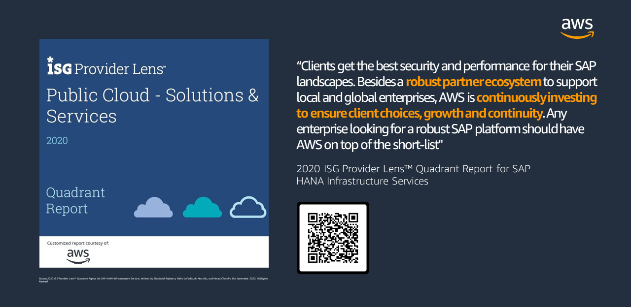 「AWSは、SAP HANAワークロードをプラットフォーム上でホストする幅広いサービスで市場を支配しています。また、AWSはパートナーの数が最も多く、専門的なSAPコンピテンシー認定プログラムもあります。」— 2020 ISG Provider Lens™ Quadrant Report for SAP HANA Infrastructure Services