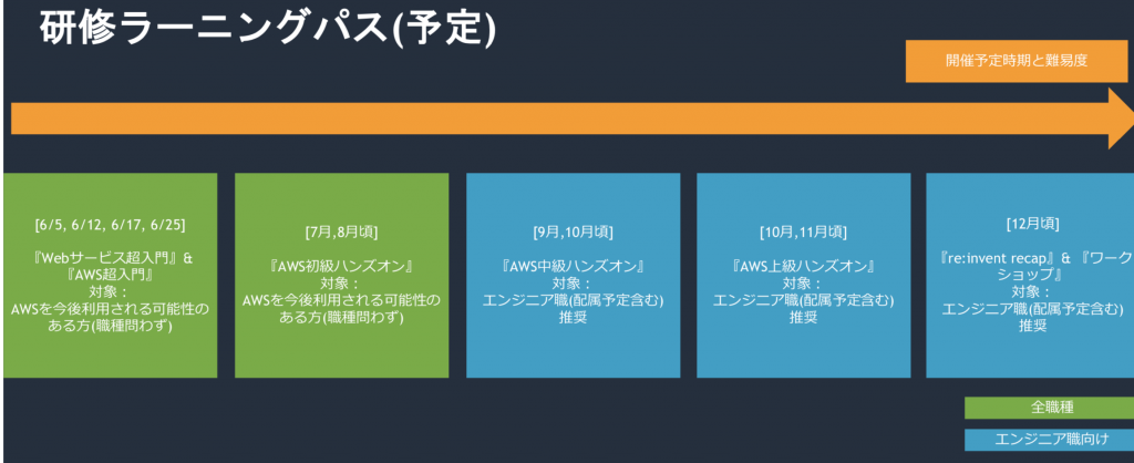 9月以降はエンジニア職の方に向けた中級〜上級ハンズオンを実施予定です。こちらはAWS上でスケーラブルなWebアプリを構築するハンズオンや、Container/Serverless/Mobileに特化したハンズオンを実施する予定です。