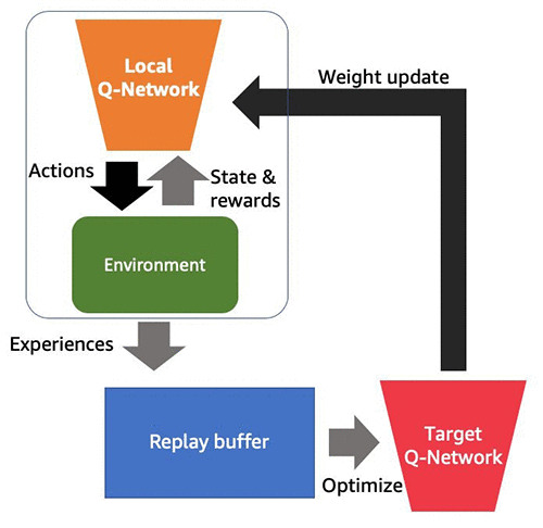 次の図は、DQN のさまざまなコンポーネントとデータフローを示しています。