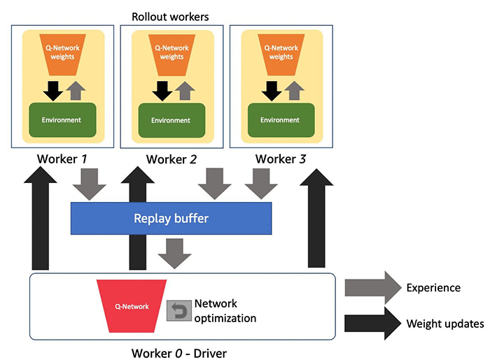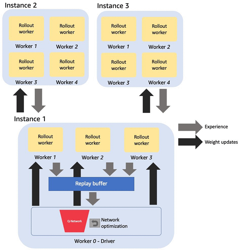 RL エージェントは通常、試行錯誤しながら環境とのインタラクションを通じてポリシーを開発します。トレーニングプロセスの間、エージェントはシミュレーションのステップを収集して学習し、ポリシーを調整します。シミュレーション手順は、エクスペリエンスまたはロールアウトとも呼ばれます。この投稿では、DQN を例として使用しています。DQN は、ターゲットおよびローカルの Q-Network での勾配ベースの最適化のために、リプレイバッファとポリシー間の通信に依存しています。詳細については、Amazon SageMaker の強化学習を使用して AI で駆動する Battlesnake を構築するを参照してください。