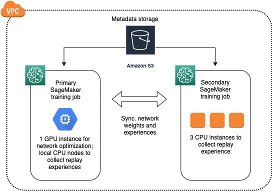 ロールアウトワーカーが増えると、ニューラルネットワークの更新がボトルネックになることがよくあります。この場合、異なるインスタンスタイプを一緒に使用する異種スケーリングを使用できます。一般的には、GPU インスタンスを使用してネットワーク最適化を実行するとともに、CPU インスタンスを使用してエクスペリエンスを収集して、最適化されたコストでより高速なトレーニングを行います。Amazon SageMaker では、同じ Amazon VPC 内で 2 つのジョブをスピンアップすることでこれを実現でき、インスタンス間の通信は自動的に処理されます。