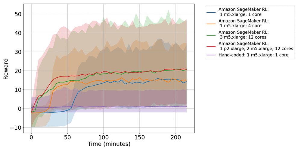 トレーニングに関しては、MXNet、単一インスタンス、および同種スケーリングジョブが、同一インスタンスタイプ (ml.m5.xlarge) を使用して実行されます。異種スケーリングジョブのプライマリインスタンスタイプは GPU インスタンス (ml.p2.xlarge) で、セカンダリインスタンスは ml.m5.xlarge です。次のグラフは、平均エピソード報酬で評価されたパフォーマンスを示しています。