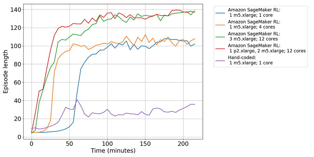 以前のポリシーは 20 時間を超えてトレーニングされました。これは両方のグラフに反映されています。3 時間のトレーニング後に報酬とエピソードの長さがわずかに増加しただけです (ハンドコード: 1 つの m5.xlarge; 1 つのコア)。グラフは、以前のポリシーと現在のポリシーの間で、獲得した報酬が少なくとも 7.5 倍、エピソードの長さが 2 倍長くなっていることを示しています。単一インスタンスジョブを比較すると (Amazon SageMaker RL: 1 つの m5.xlarge、1 つのコアと、Amazon SageMaker RL: 1 つの m5.xlarge、4 つのコア)、複数のコアを持つ単一インスタンスは、単一コアのジョブよりもパフォーマンスが優れています。これは、複数のインスタンスを使用する場合にさらに顕著になります。すなわち、異種スケーリング (Amazon SageMaker RL: 1 つの p2.xlarge、2 つの m5.xlarge、12 個のコア) は、単一インスタンスと同種スケーリングのジョブ (Amazon SageMaker RL: 3 つの m5.xlarge、12 個のコア) よりも優れています。異種スケーリングのジョブでは、以前の実装と比較して、報酬が少なくとも 10 倍、エピソードの長さが 3 倍長くなりました。