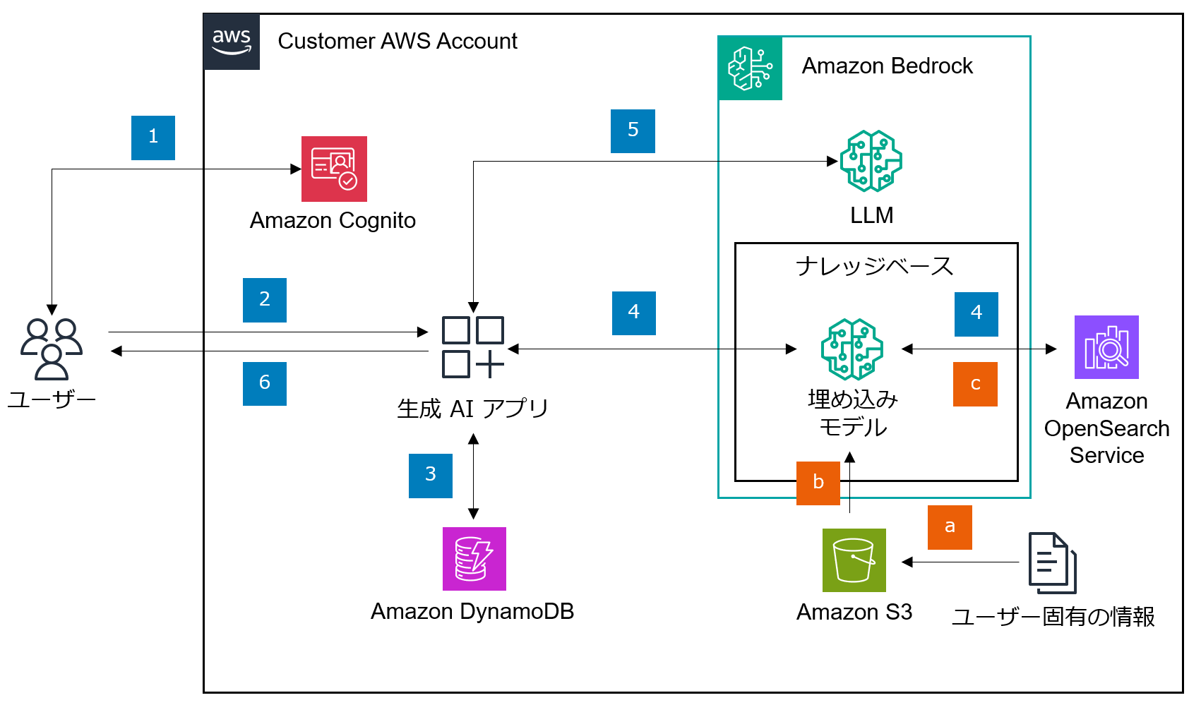 • Amazon S3:LLM が事前学習していないユーザー固有の情報を生成 AI アプリケーションが利用できるようにするために、ユーザー固有の情報を保管するデータソースです。