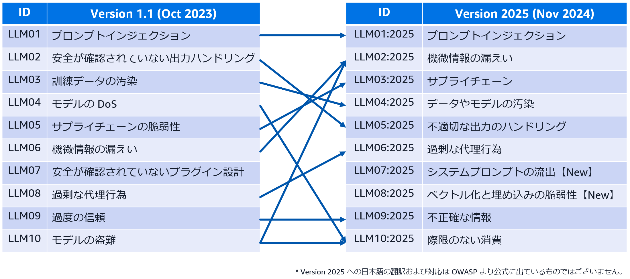 図 2: OWASP Top 10 for LLM Applications の Version 1.1 と Version 2025 の変更点比較