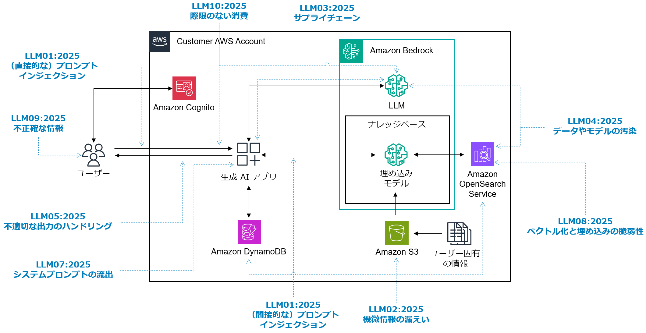 OWASP Top 10 for LLM Applications の各脆弱性を AWS 上で構成する生成 AI アプリケーションで考えられるように、図2 のアーキテクチャ上にマッピングしてみましょう。