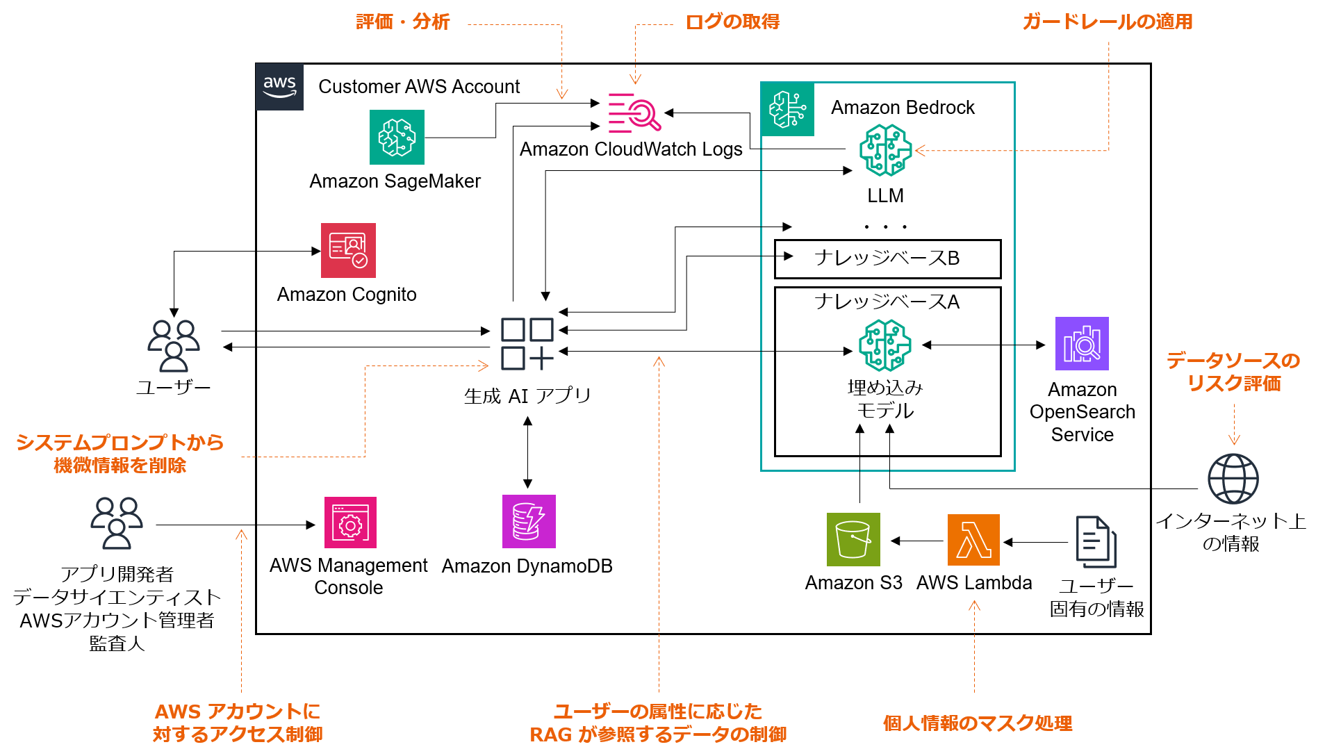 ユーザー固有の情報の保護のために適切なアクセス制御が必要です。ここでは AWS アカウントと RAG の 2 つの観点で考えてみましょう。まずは AWS アカウントについて、関係者を洗い出してみます。生成 AI アプリケーション開発者はもちろん、精度評価や改善を行うデータサイエンティスト、マルチアカウント環境の管理者や監査人などです。次にユーザー固有の情報が含まれるコンポーネントを特定します。S3 や OpenSearch、DynamoDB、またモデル呼び出しのログを記録する場合はログを格納する Amazon CloudWatch Logs や S3 などです。これらを踏まえ、アイデンティティベース、あるいはリソースベースのポリシーを活用し適切にアクセス制御を行います。厳格にアクセス制御を行うことが難しい場合、代わりに Amazon GuardDuty のような脅威検出サービスを使って S3 バケットへの異常な振る舞いや脅威を検知したり、 S3 や DynamoDB のデータに対するアクセスを AWS CloudTrail のデータイベントとして取得し、データに対するアクセスを追跡できるようにしておくことも考えられます。