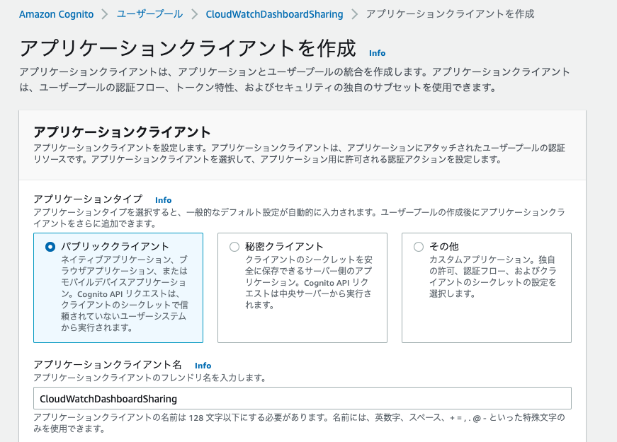 図 10: CloudWatch ダッシュボードを利用するための新しいアプリクライアントの作成 (1)