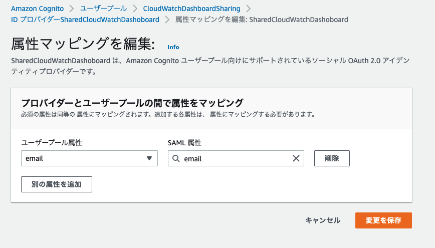 - Cognito コンソールで、作成されたIDプロバイダーを選択し、属性マッピングをクリックします。ID プロバイダーから Cognito に一貫してユーザー ID をマッピングできるように値を追加する必要があります。別の属性を追加 をクリックし、ユーザープール属性と SAML 属性の両方に email を入力します。その後、変更を保存 をクリックします。