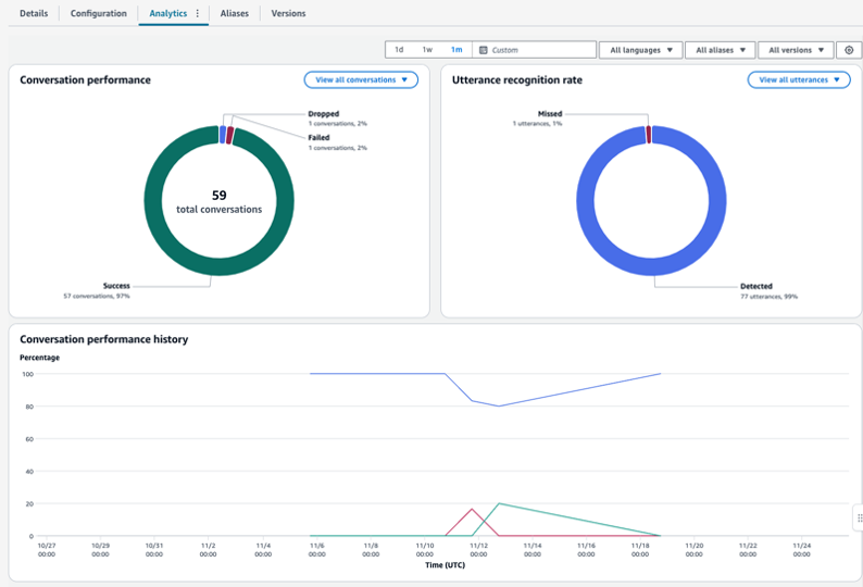 ダッシュボードのボットエイリアスとバージョンによるフィルタリング機能により、A/B テストとパフォーマンス測定が容易になり、組織はセルフサービス体験を最適化するためのデータドリブンな意思決定を行うことができます。自動化されたインタラクションに関するこの詳細な可視性は、企業が顧客体験戦略を継続的に改善し、セルフサービスの効果を向上させるのに役立ちます。