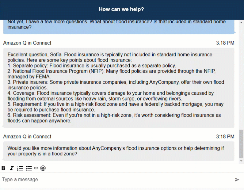 Amazon Q in Connect は、ナレッジベースのコンテンツと顧客情報から、より自然で文脈に即した応答を提供することで、既存のセルフサービス体験を強化できます。ボット用の個別の応答テンプレートを維持する代わりに、エージェントが使用するのと同じナレッジベースのコンテンツを活用して、顧客の問い合わせに適切な応答を生成することができます。これにより、セルフサービスとエージェント支援の両チャネルで一貫性を確保しながら、複数のコンテンツソースを管理する負担を軽減できます。