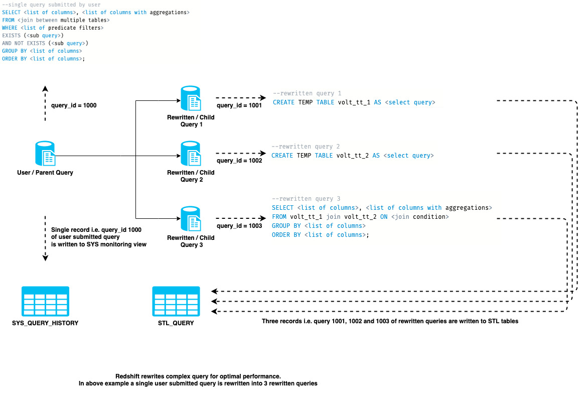 クエリのパフォーマンスを向上させるために、Redshift クエリエンジンはユーザーが送信したクエリを書き換えることができます。 ユーザーが送信したクエリの ID は、書き換えられたクエリの ID とは異なります。 この記事では、ユーザーが送信したクエリを親クエリ、書き直したクエリを子クエリと呼びます。