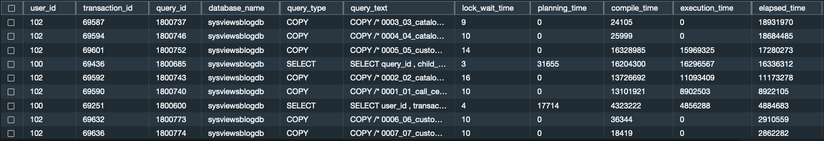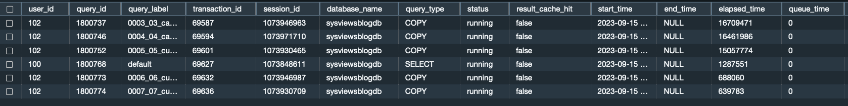 SYS_QUERY_HISTORY では、実行中のすべてのクエリと実行履歴を一元的に確認できます。 次のクエリの例を参照してください: