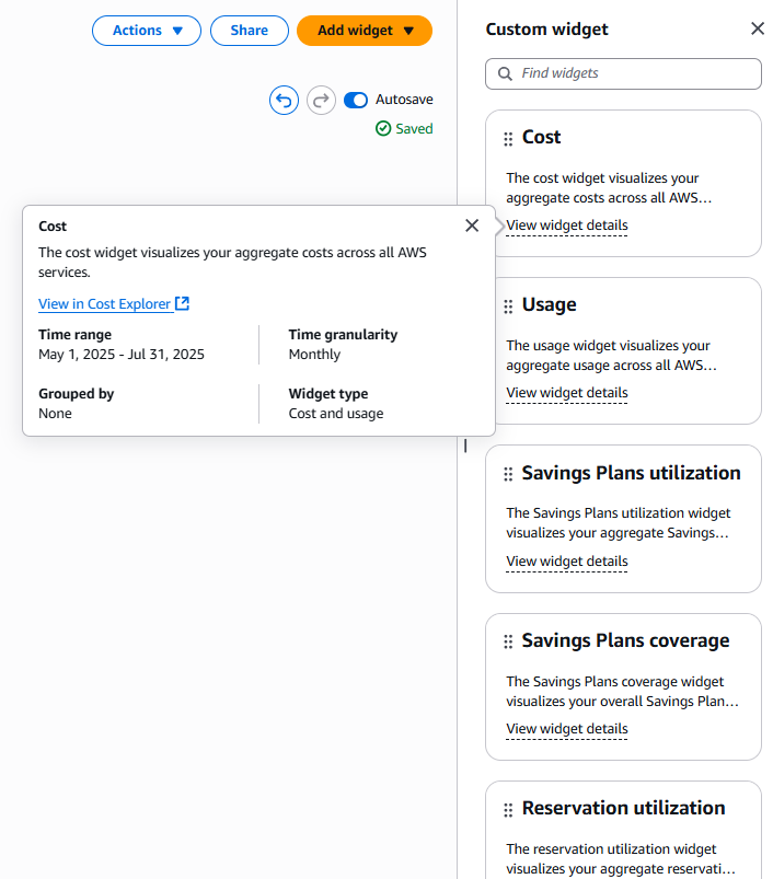 事前定義済みウィジェット:すぐに使用可能なウィジェットで、サービス別月次コストや日次コストなど、一般的な用途に合わせて事前構成されています。レポートニーズに応じて、追加でカスタマイズすることも可能です。