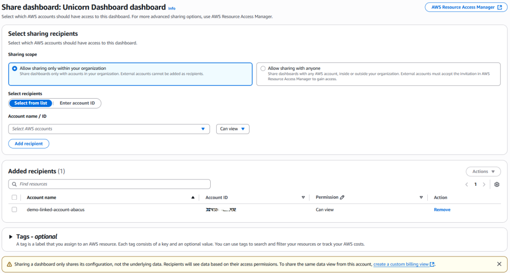 共有機能:AWS Organizations 内のアカウントや、AWS Resource Access Manager (RAM) を使用して外部アカウントへ作成したダッシュボードを共有することができます。共有時には、「閲覧のみ」または「編集可能」のアクセス権限を設定できます。ダッシュボードを共有しても、コスト関連の元データそのものが共有されるわけではありません。共有されるのは各ウィジェットの設定 (例:表示されるコストメトリクスやフィルター) とレイアウト情報のみです。組織内のメンバーアカウントに対して、複数アカウントを跨ぐコストと使用状況ビューへのアクセスを許可するカスタム請求ビューを作成することが可能です。共有先のアカウントでは、同一レイアウト・同一フィルターで、自身に許可された範囲のデータを表示することができます。