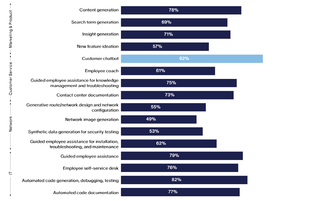 通信事業者の4つの業務領域(製品・マーケティング、カスタマーサービス、ネットワーク、社内IT)をまたぐ17のユースケースについて調べたところ、生成系AIを既に活用しているか、活用に向けて取り組んでいるとした回答者は全体の19%でした。この数値は今後、さらに拡大する見込みで、調査結果によると1年以内に34%、2年以内に半数近く(48%)に達する見込みです。これに伴い、生成系AIへの支出も現在の最大6倍に急拡大する可能性があります。この急拡大を牽引するユースケースはチャットボットですが(詳細は後述)、通信事業者の64%は、検討している生成系AIのユースケースの多くが、既存のアプリケーションやプロセスではまだ実現されていない新たなアプリケーションだと述べています。