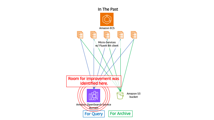 タップルは、マッチングアプリの初期デプロイ時からAmazon OpenSearch Serviceを利用しています。アプリケーションログ基盤は、直近1か月のデータを保持するAmazon OpenSearch Serviceドメインと、データを長期間アーカイブするAmazon S3とAmazon Athenaで構成されています。既存のソリューションでは、コンテナホストからそれらにFluent Bitエージェントでログを直接書き込むよう構成されていました。
