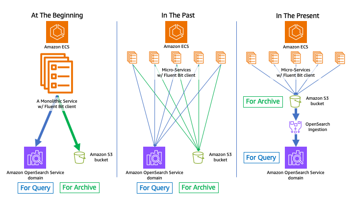 タップルは、サービス開始当初はモノリシックアーキテクチャだったバックエンドを、サービスの成長に合わせてマイクロサービスアーキテクチャに変更しました。マイクロサービスへの移行の過程で、タップルを構成する各マイクロサービスは、Fluent Bitを使用してAmazon OpenSearch Serviceドメインに個別に直接書き込むようになりました。