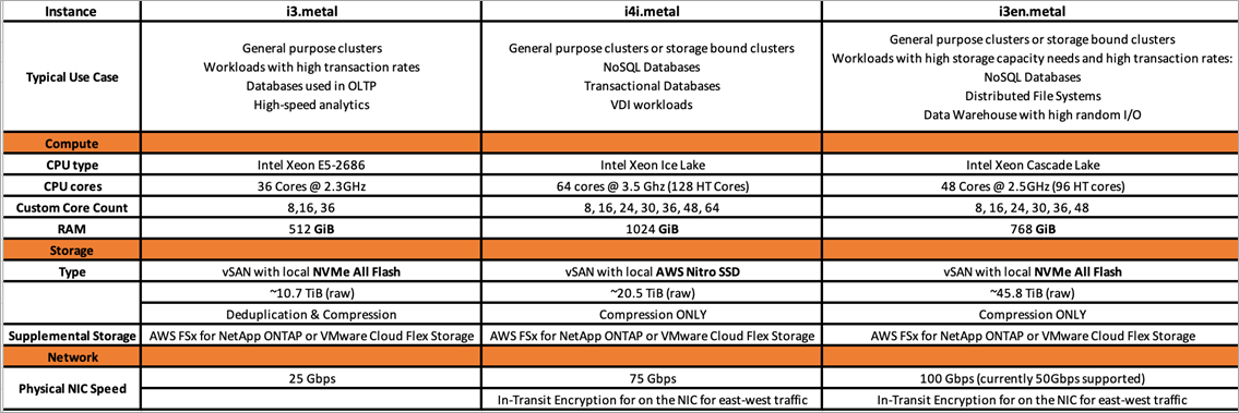 VMware Cloud on AWS は i3.metal と i3en.metal の 2 種類のベアメタルインスタンスを提供しています。これらは、一般的なワークロード、高速な分析、NoSQL データベース、分散ファイルシステムなど、さまざまなユースケースをサポートしてきました。i3.metal と i3en.metal のユースケースの詳細については、以下の図 2 を参照してください。