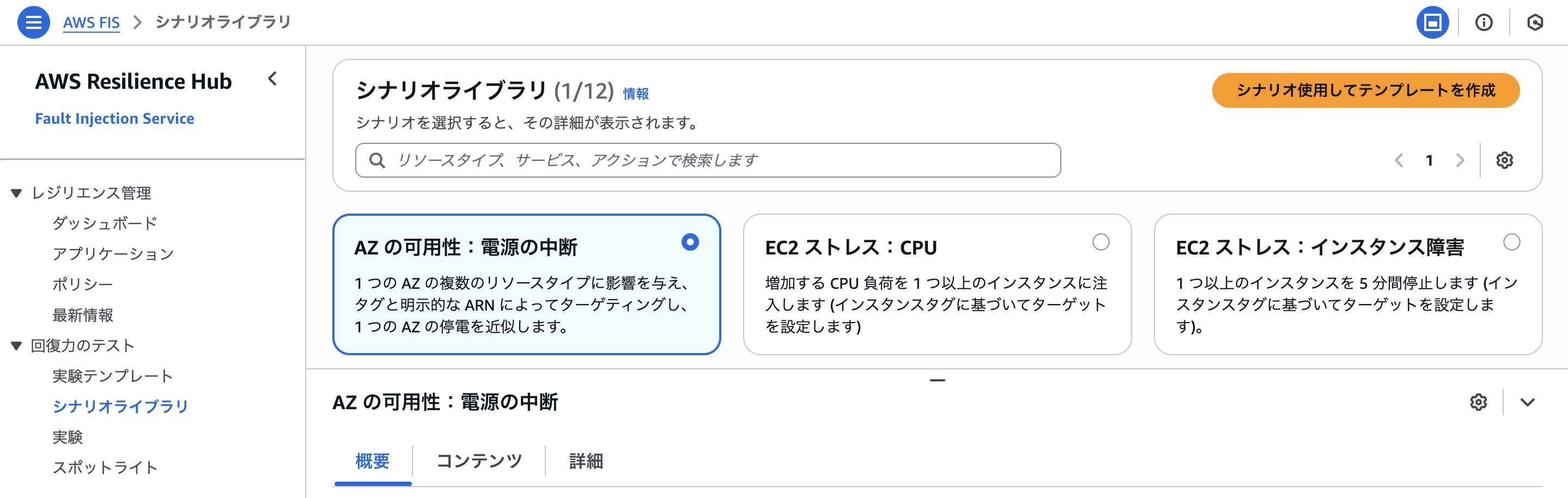 開始するには、AWS FIS シナリオライブラリから AZ の可用性:電源の中断シナリオを選択して、実験テンプレートを作成します。