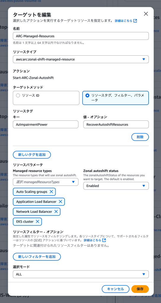 この新しいパラメータ群は、ターゲットメソッド (リソース ID やリソースタグなど) に加えて、リソースを対象とするための Managed resource types と Zonal autoshift status を提供します。