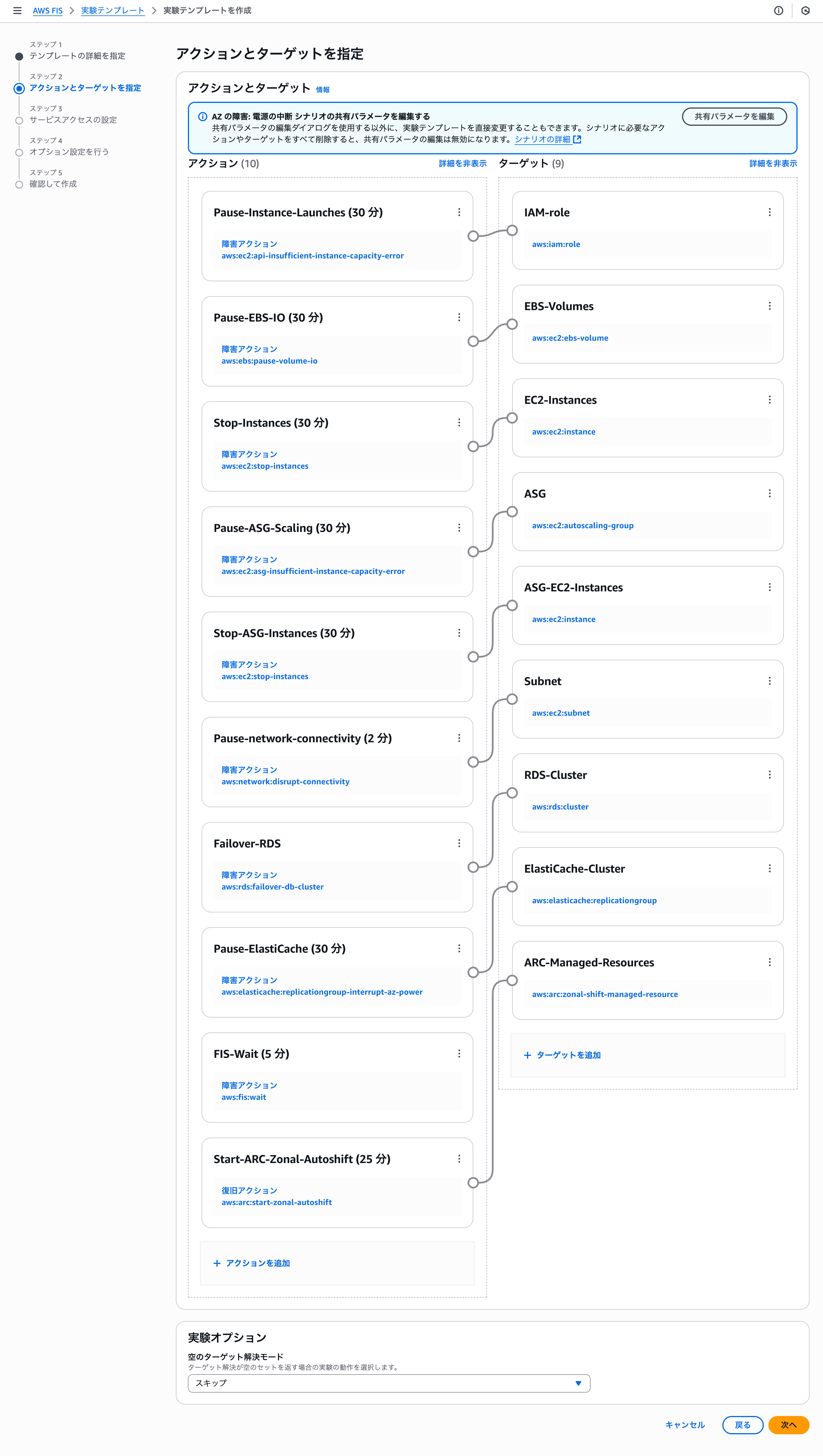 Availability Zone identifier: ゾーンオートシフトでトラフィックを移動させる AZ を選択します。また、共有パラメータを編集を使用することで、実験内のすべてのアクションに対して一貫した値で共有パラメータを設定できます。