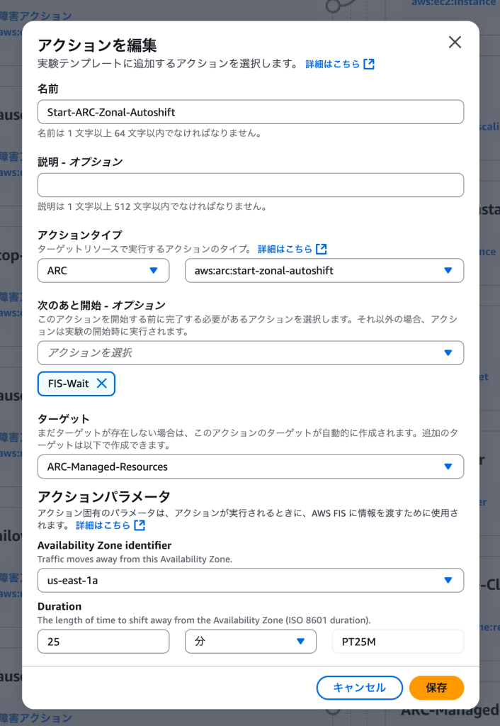 Duration: 時間の値は、実験内の他のアクションが終了してトラフィックの移行を開始するタイミングと同時に、ゾーンオートシフトが終了するように設定されます。期間は、上記で説明したゾーンオートシフトをトリガーする前の 5 分間の待機時間を考慮して、[ 障害継続時間 - 5 minutes] に設定されます。たとえば、実験の停止時間が 30 分の場合、ゾーンオートシフトの期間は 25 分に設定されます。