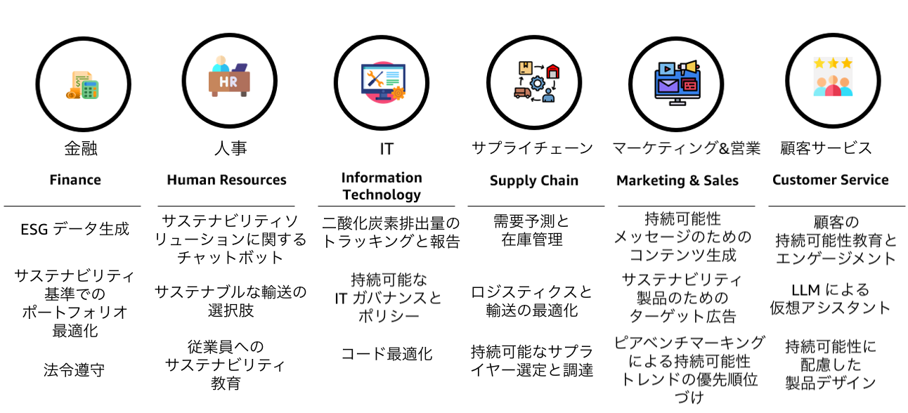 生成 AI は、大量のデータを分析し、パターンを特定し、文書を要約し、翻訳を行い、エラーを修正し、質問に答えるなどの幅広い能力を備えており、ビジネスのあらゆる部分を変革する力を持っています。これらの能力は、組織のバリューチェーン全体を通じて付加価値を提供するために活用できます。図 1 は、バリューチェーン全体における持続可能性のための生成 AI の活用事例の一部を示しています。