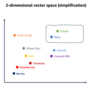 これらの数値は、多次元ベクトル空間で要素を相互に関連づけてマッピングするのに使用されます。ベクトル要素がセマンティックである ( 1 つの意味を表す) 場合、近接性が文脈関係の指標となります。このように使用される場合、これらのベクトルは「エンベディング (埋め込み) 」と呼ばれます。たとえば、食料品や料理の分野の文脈を表す多次元空間では、「チーズ」のセマンティック要素が「乳製品」のセマンティック要素の近くに置かれることになります。特定分野の文脈によって、セマンティック要素は単語、フレーズ、センテンス、パラグラフ、文書全体、画像、あるいはまったく別のものになる可能性があります。特定分野のデータセットを、互いに関連性のある意味要素に分解します。たとえば、以下の図は、料理の文脈のベクトル空間をわかりやすく示したものです。