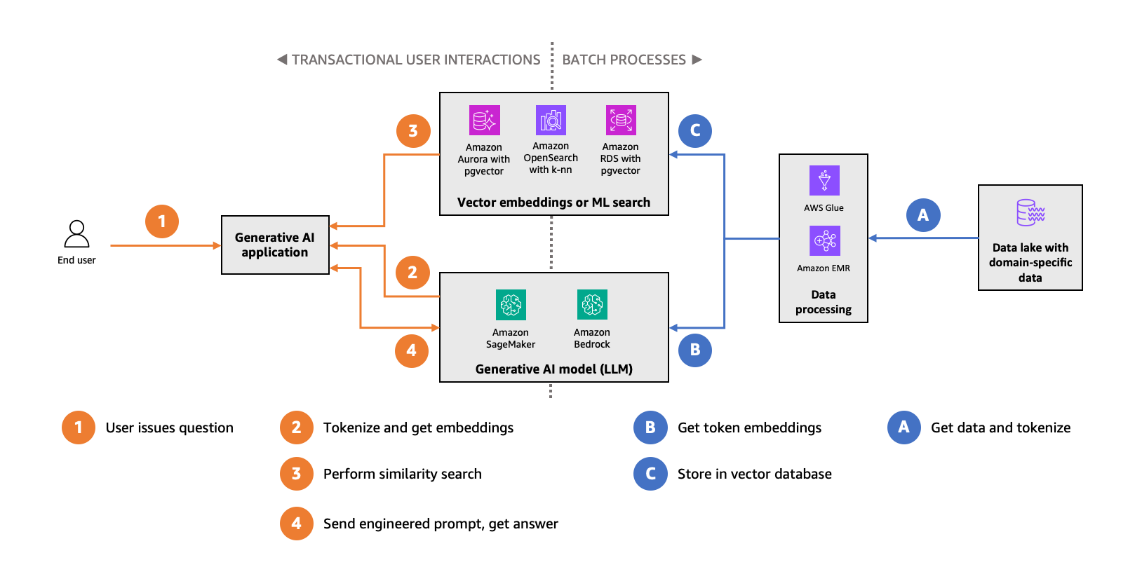 エンドユーザーのクリティカルパス内でベクトルデータストアの類似性検索を実行する場合は、同時読み取りクエリを使用します。ベクトルデータストアに埋め込みを追加し、データの変更に対応するためのバッチ処理は、そのほとんどをベクトルデータストアへのデータ書き込みが占めています。このような使用パターンの側面と、前に述べた習熟度や規模といった考慮事項によって、どのサービス (Amazon Aurora PostgreSQL、Amazon OpenSearch Service、Amazon OpenSearch Serverless 用のベクトルエンジン、Amazon RDS for PostgreSQL) が適切であるかが決まります。