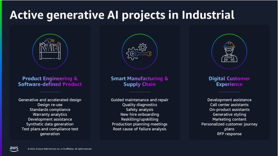 生成 AI は、業務を合理化し、製品の品質を高め、サプライチェーン管理を改善する革新的なソリューションを提供し、製造業を変革していることは間違いありません。ハノーバーメッセ 2024 で、AWS と AWS パートナーは、製造業のお客様が生成 AI の力を活用し、今までにない洞察を得て、プロセスを最適化したり、イノベーションを推進する方法を紹介しました。AWS は、Amazon Bedrock、Amazon SageMaker、Amazon Q、AWS Inferentia などのツールにより、生成 AIアプリケーションを既存のオペレーションに統合することをこれまで以上に容易にする幅広いテクノロジースタックを提供しています。