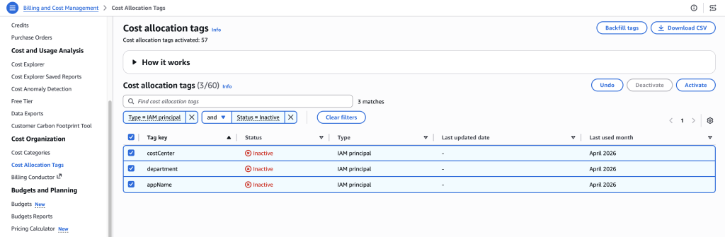 次に、Billing コンソールでタグを有効化し、コストレポートに表示されるようにします。タグが有効化の対象として表示されるのは、そのタグが付与された IAM プリンシパルが少なくとも 1 回 API コールを実行した後です。IAM ユーザー、ロール、ロールを引き受けたセッションのいずれでも同様です。