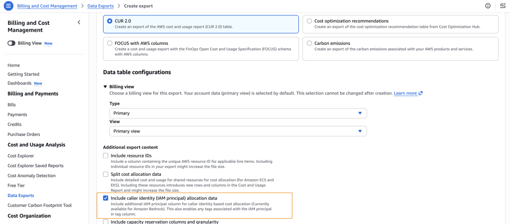 最後に、CUR 2.0 エクスポートに呼び出し元の ID データを含めるよう設定します。