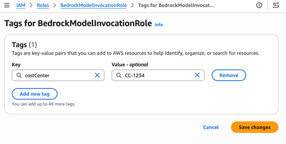 まず、Bedrock API を呼び出す IAM ユーザーとロールに、わかりやすく標準化されたキーでタグを付与します。