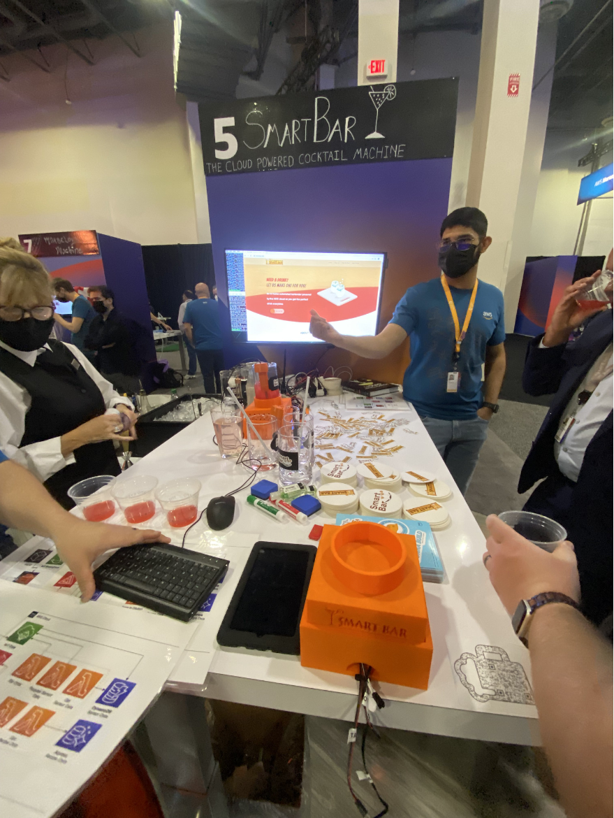 EXPO会場では、参加者がコーヒーを楽しみながら革新に満ちたデモンストレーションを体験できました。ServerlessチームはServerless Point-of-Sale (POS)のデモを行い、GitHubでコードを公開しました。Vistryは、リリースされたばかりのAmazon Outpost Servers(2 Uおよび 1 Uフォームファクタ)上で動作するカフェのオペレーションを完全に観察するためのComputer Vision(CV)のデモを行いました。そして、ビルダーズラボでは、IoTを利用して完璧なカクテルを科学的に調合する方法を紹介しました。17 時を過ぎると、re:Invent参加者の間で交流の機会を楽しむことができました。