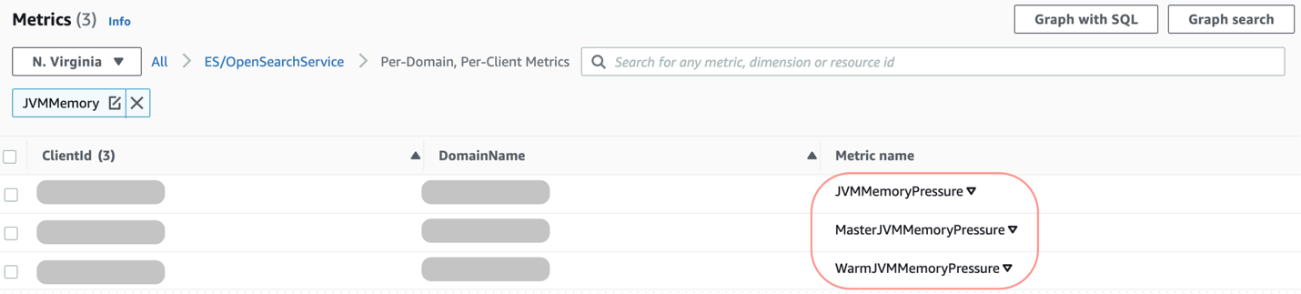 CloudWatch コンソールを使用し、これらのデータポイントに関する統計情報を、メトリクスと呼ばれる時系列データの順序付きセットとして取得することができます。Amazon OpenSearch Service は、現在、JVM メモリプレッシャーに関連する3つのメトリクスを CloudWatch に発行しています。