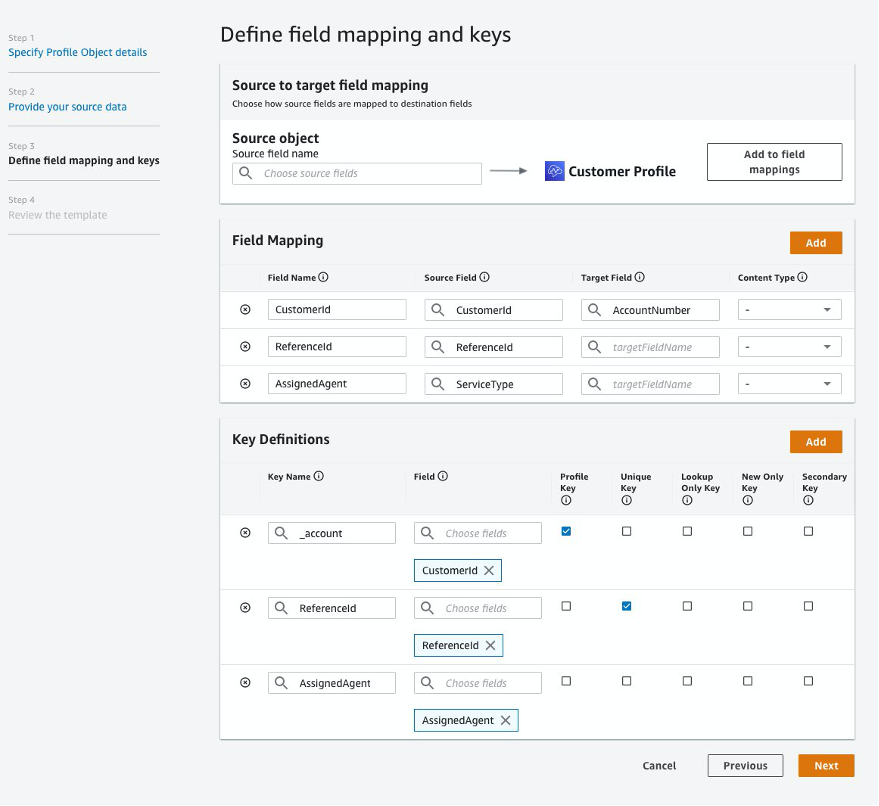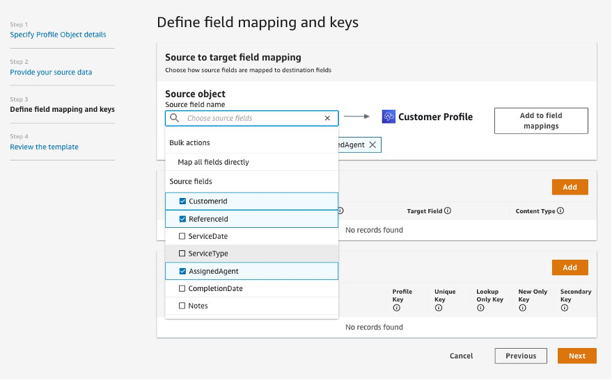 - Source field name ドロップダウンでCustomerIdとReferenceId、AssignedAgentを選択します