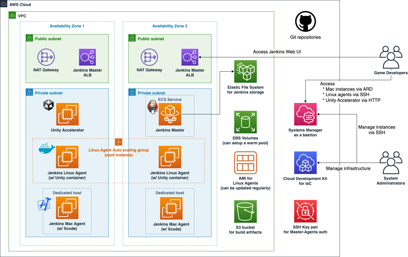 また AWS for Games では Unity のビルドパイプラインに関するリファレンスアーキテクチャを公開しており、Workshop に則る事で Amazon Elastic Compute Cloud (EC2) スポットインスタンスと Mac インスタンスを活用し、Jenkins により自動化された iOS アプリケーションのビルドパイプラインを構築可能です。
