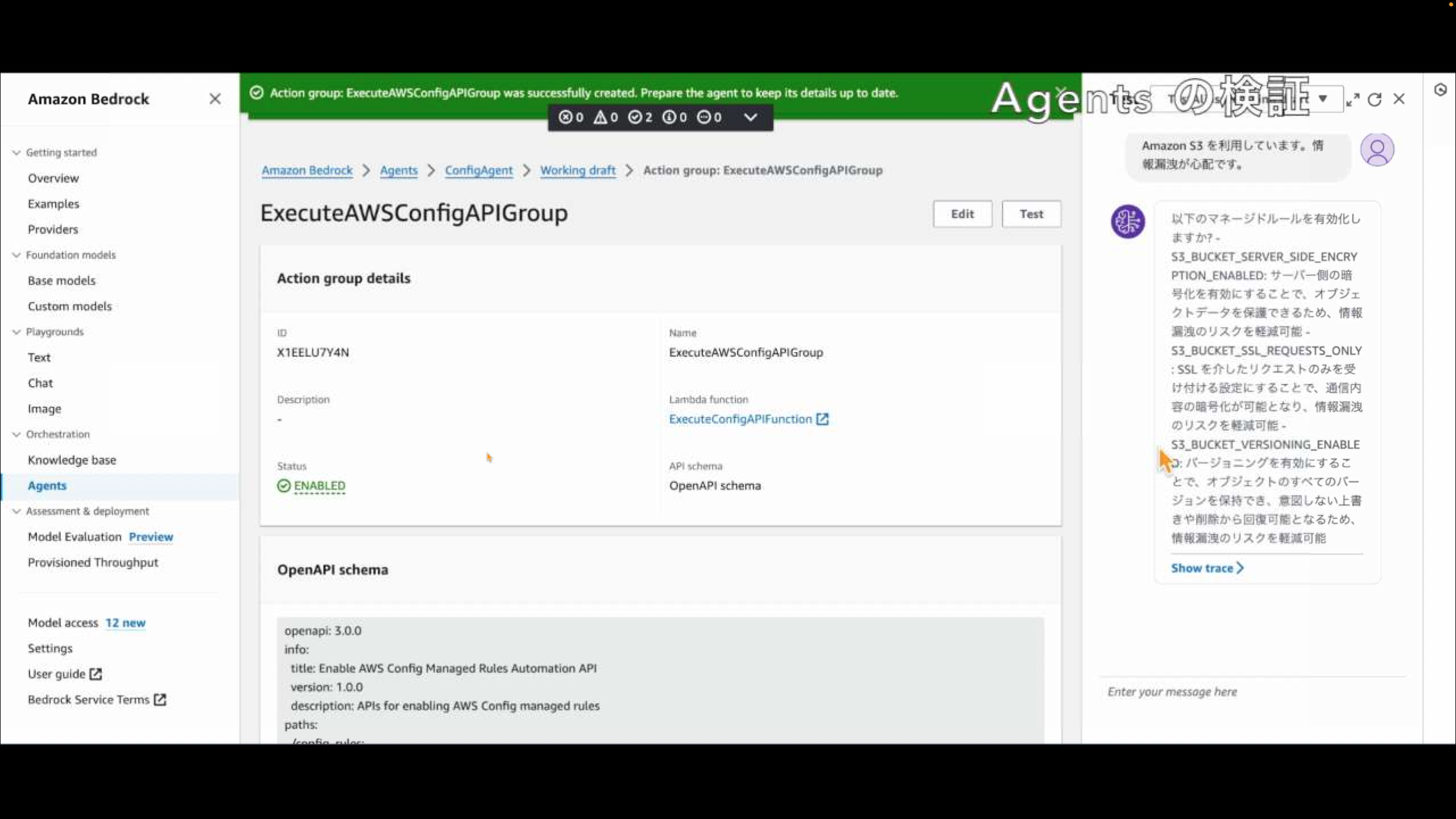 - RAG を行う機能である Knowledge Bases for Amazon Bedrock とエージェント構築機能である Agents for Amazon Bedrock が re:Invent 2023 で GA となりました。これらの機能を利用して、350 以上ある AWS Config のマネージドルールからおすすめルールの提案と有効化まで Amazon Bedrock に行ってもらいましょう。本セッションでは Amazon Bedrock の概要と GA となった新機能を利用したデモをお届けします。