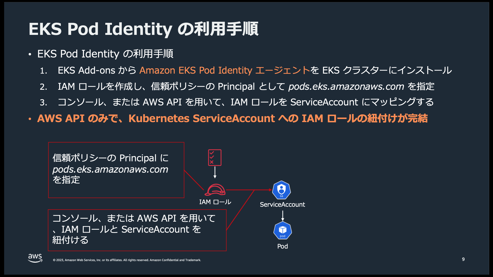 - Amazon EKS 2023 年 冬のアップデートを振り返ろう 〜 EKS Pod Identity & Mountpoint for Amazon S3 CSI driver 〜 (15 分)